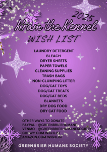 The Primary mission of the Greenbrier Humane Society is to protect animals from neglect, abuse and exploitation: to advocate for their interest and welfare: and to inspire awareness and compassion for all living things.